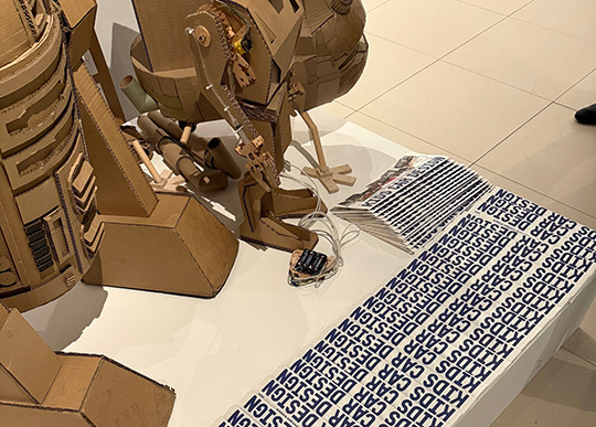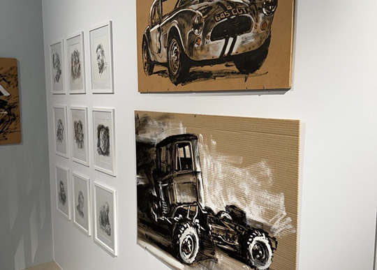 Экспозиция включает почти 200 графических работ, часть из них выполнена на гофрокартоне. Этот материал придаёт произведениям особую выразительность и достоверность.